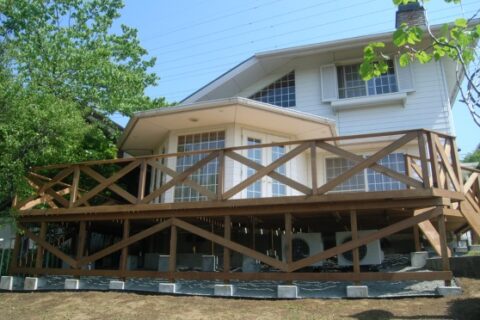 天然木(ウリン材)を使用した味のあるウッドデッキテラス、デッキから見下ろす風景は...